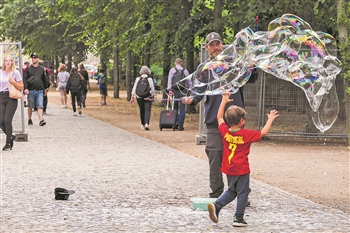 据外媒报道,德国总理默克尔10日与各州州长就下一步防疫措施达成决议,除维持社交距离、佩戴口罩等现有防疫规定外,还将采取措施促使更多民众尽快接种新冠疫苗,防范第四波疫情。图为一名街头艺人在德国首都柏林表演造肥皂泡。