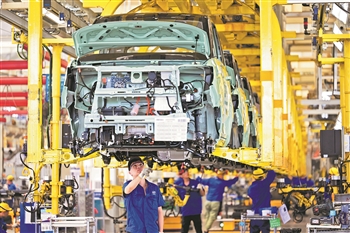 8月12日,在广西柳州一家汽车企业,工人在新能源汽车生产线上忙碌。