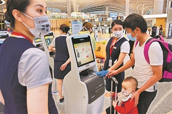 8月12日,工作人员在航站楼协助旅客办理登机牌。当天零时,青岛胶东国际机场正式实施转场运营,青岛流亭国际机场同步关闭。