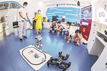8月12日,河北邯郸市复兴区百家街道钢三社区的小朋友在科技馆操作机器人。