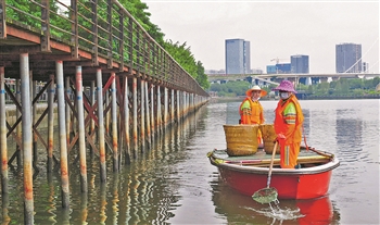 王桂药和刘凤美结婚已有41年。婚后,二人以养鱼为生。后来养鱼不景气,2011年,两个人在福建一家环卫公司工作,妻子被分配到浦下河当河面保洁员,王桂药则做了路面环卫工人。过了3年,刘凤美跟公司提议让王桂药跟着自己一起工作,最后两个人在同一条船上又开始了船头和船尾的平凡生活。周义 摄(新华社发)