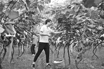 8月10日,安徽省肥西县花岗镇杨湾村村民丁翔在农场葡萄园里采摘葡萄。2017年,丁翔大学毕业后回到家乡,打造以葡萄种植园为主的家庭农场。经过几年的建设,农场初具规模,日常管理有不少用工需求,带动周边村民就业增收。新华社记者 刘军喜 摄