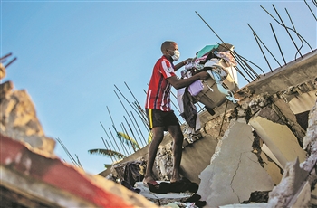 下图:8月14日,在海地莱凯,一名男子在被地震毁坏的家中搜寻物品。新华社/美联
