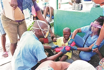 上图:8月14日,古巴医疗队在海地莱凯救助地震后的伤员。新华社发