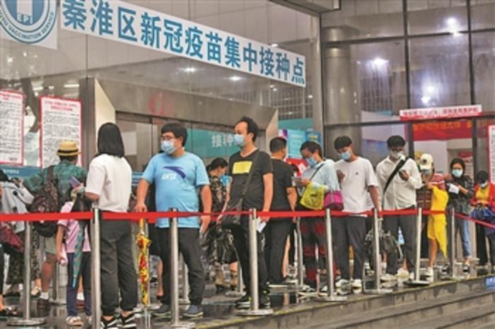 8月16日,在南京市秦淮区新冠疫苗集中接种点,市民排队准备接种疫苗。