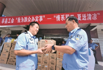 当日,莘县总工会给354名交警送去香皂、毛巾、花露水、风油精等解热防暑用品,感谢交警的默默坚守与辛勤付出。本报通讯员 冯永华 摄