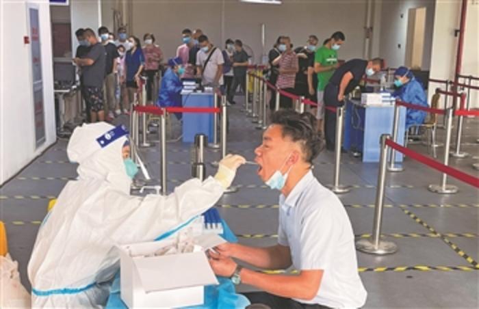 8月15日中午,北京亦庄的一处核酸采样点,来不及休息的工作人员正穿着厚厚的防护服为市民进行核酸采样。近日,为方便市民采样,不少核酸采样点的工作人员不得不在高温下工作,为民众健康筑起防护网。本报记者 王伟伟 摄