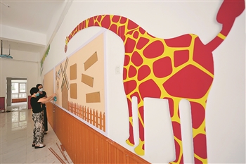 8月17日,沙河市一家幼儿园的老师在装饰墙体。
