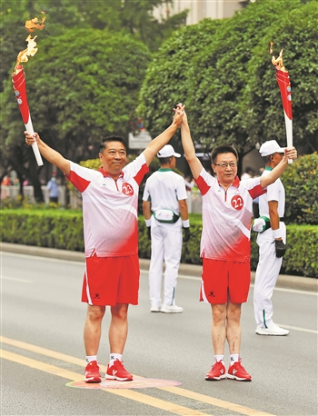 8月16日,火炬手刘自立(前左)和刘红春(前右)在火炬传递中。当日,第十四届全国运动会、第十一届全国残运会暨第八届全国特奥会火炬传递点火起跑仪式,在陕西省西安市永宁门(南门)广场举行,100名火炬手完成首站的接力奔跑。新华社记者 刘潇 摄