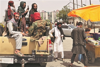 8月17日,阿富汗塔利班成员在喀布尔街头向小贩购物。新华社发