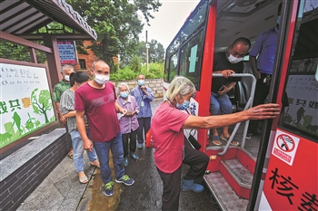 8月17日,浙江省诸暨市赵家镇桃岭村村民排队上公交车,准备前往山下的镇区。桃岭村海拔800米,从村里到山下有40多道弯,2020年底正式通了公交后,方便了村民出行。