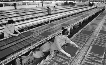 8月15日,江西省德兴市祥兴伟业织造有限公司的工人正给销往欧美的编织带加上色印花。
