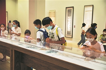 8月18日,北京,中国美术馆内,孩子们在大人的带领下欣赏美术作品。暑假期间,不少博物馆、美术馆成为了青少年打卡度假的好去处。一位家长表示,趁着暑期和孩子一起逛美术馆,不仅拓展了视野,也是一项很好的亲子活动。