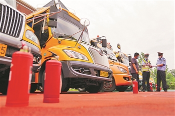 临近开学,河北省邢台市开展校车安全专项检查,对中小学校、幼儿园校车的轮胎、后视镜、停车牌、灭火器等进行检查,以排除隐患,保障学生乘车安全,迎接新学期的到来。新华社发(田晓丽 摄)