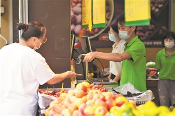 8月23日,市民在郑州市金水区丰庆路一家水果店购物后结账。根据气象部门消息,郑州市本轮强降雨过程已结束。当日,郑州市防汛抗旱指挥部决定,自8月23日15时起,有序恢复正常生产生活秩序。