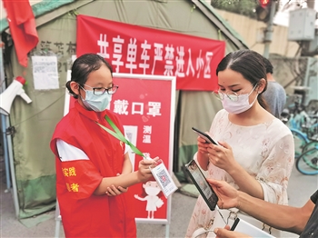 近日,13岁的周婧怡穿着红马甲,戴着红袖章,脖子间挂着北京健康宝二维码,在北京市海淀区西北旺镇亮甲店社区颐和山庄小区门口参与社区防疫。该社区自8月12日启动疫情防控“机动志愿者”项目以来,吸引了许多居民参与。