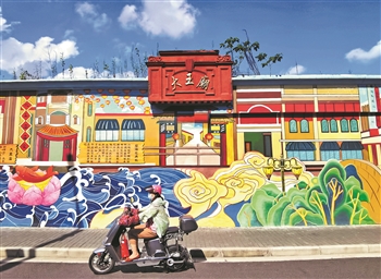 上海大田路顺德路路口的一堵“大王庙”彩绘文化墙,墙面描绘着“暮春三月,乡民聚集庙会,迎神赛会”的民俗热闹场景。