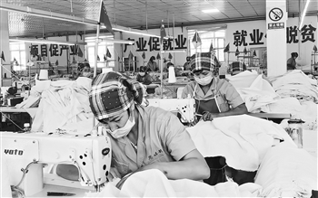今年以来,新疆维吾尔自治区库车市深入实施就业惠民工程,采取招商引企开发就业岗位、开展就业服务专场活动等举措,拓展就业渠道、增加群众收入。今年1月~7月,当地新增城镇就业6385人。图为库车思祺制衣厂职工加工制作麻布包。本报记者 吴铎思 摄