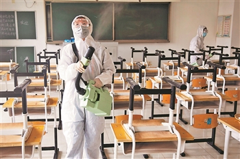 8月30日,北京市第十八中学初中部,志愿者正在教室内进行消杀工作,准备迎接秋季开学。北京市各大中小学坚持把保证师生身体健康放在第一位,目前正按照原定开学时间做好各项准备。本报记者 王伟伟 摄