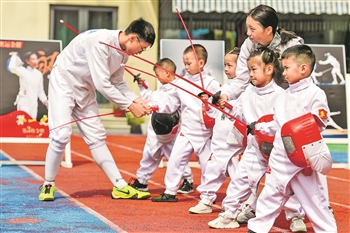 8月30日,浙江省湖州市长兴县实验幼儿园,孩子们正在学习击剑动作。当日,长兴县实验幼儿园开展“体验奥运击剑·共筑英雄梦想”开学第一课活动,邀请长兴县少年儿童业余体校击剑队教练、运动员走入学校,为孩子们表演奥运会比赛项目击剑操练,并手把手指导孩子们学习击剑动作、实战体验击剑,营造积极健康的校园体育文化氛围,让孩子们感受奥运精神,种下英雄梦想。本报通讯员 谭云俸 摄