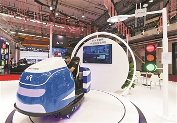 8月31日, 在2021世界5G大会展览现场,媒体从业人员体验5G+车联网VR虚拟驾驶。