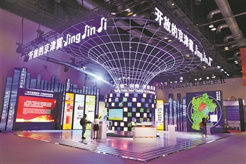 紧邻着中国服务贸易发展成就展的是京津冀展区,它是本届服贸会唯一一个国内跨省域以协同发展为主题的展区。为了让参观者有更加丰富的观赏体验,展区内布置了可以被点亮的“种子墙”、 会发出声音的“聆听京津冀”话事墙以及京津冀动态开放地图,让展区可视、可听、可互动,立体化展现了京津冀三地协同开放、一体发展取得的丰硕成果。