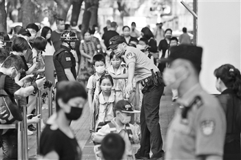 9月1日,开学第1天。在北京市西单小学门口,来自西城区二龙路派出所的公安民警曹雪桐提醒入校的孩子们排队要保持1米距离、戴好口罩,并帮助学校和家长维持周边秩序。当天,北京市公安局深入推进“护校安园”专项工作,共部署护学岗警力1.2万余人次,做好校园周边巡防守护,确保全市校园内部及周边秩序良好。本报记者 吴凡 摄
