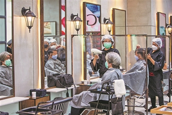 9月1日,人们在泰国曼谷一家理发店理发。泰国自当日起在曼谷及28个府放宽部分防疫限制措施,以帮助受疫情影响的餐饮服务业和经济。商场、理发店和公园等娱乐休闲场所可在遵守防疫规定的前提下重新开放。新华社记者 王腾 摄