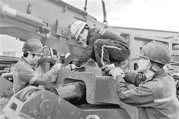 随着产能升级和技术改造,曾经靠“手挖肩挑”的小煤矿也有了大型综合机械化掘进机。图为技术人员正在调试鑫鑫煤矿的综掘机。