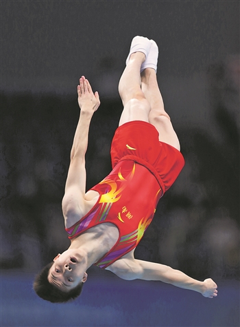 9月6日,在西安举行的第十四届全运会蹦床男子个人决赛中,湖南队选手严浪宇以61.660分的成绩获得冠军。图为严浪宇在比赛中。新华社记者 许雅楠 摄