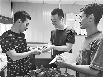图为米渊将月饼和炉馍分享给同事一起吃。本报记者 邹明强 通讯员 方国俊 摄