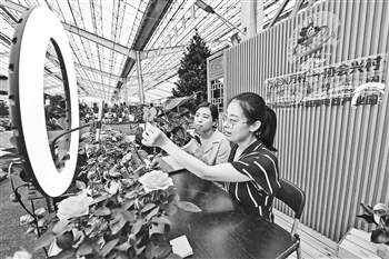 天眼查数据显示,目前我国共有近7万家鲜花电商相关企业。图为在山东省青州市花卉电商产业园,工作人员通过网络直播推销鲜花。