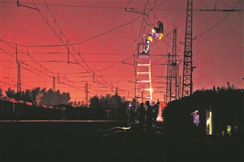9月9日,中国铁路郑州局新乡供电段安阳接触网检修工区职工利用夜间“天窗”,对宜沟站供电设备缺陷进行整治。李孟龙 摄
