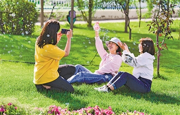 9月14日,游客在纳林陶亥镇一个煤矿复垦区公园里游玩。
