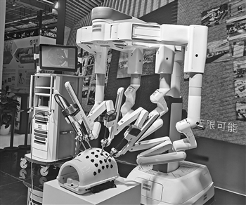 在达芬奇公司展台中央, 一个看起来像八爪鱼的腔镜手术机器人吸引了不少观众驻足。而在该展台的一角,还放置了一张手术工作台。工作人员告诉记者,医生只需操纵工作台上的主操作器,就可以对一旁手术台车上装载的手术工具和3D高清电子内窥镜进行遥控操作,完成跨科室多适应征的微创手术治疗。