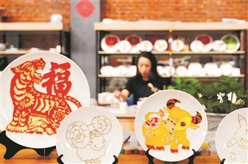 9月15日,河北省张家口市宣化区,国玉陶瓷博物馆画师进行釉下彩绘演示。