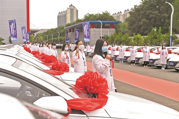 9月15日,河北石家庄四药集团举行为科研职工配备66台小汽车交接仪式。