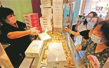 当日是传统中秋佳节。位于上海南京东路步行街的各家老字号食品店里生意红火,人们排队购买各类美食,为中秋佳节增添滋味。新华社记者 方喆 摄