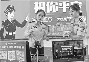 9月16日,江苏省扬州市宝应县公安局望直港派出所民警联合望直港中心初中,组织开展“警校联动 安全同行”的线上云宣传系列活动。民警在线进行反诈、禁毒等知识的授课,引导学生健康上网、远离毒品、防范网络诈骗。沈冬兵 摄/人民视觉