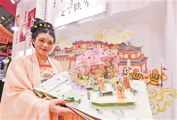 图为9月23日,盛装的参展者在第十七届文博会陕西展台展示《大唐长安》立体书。新华社记者 毛思倩 摄