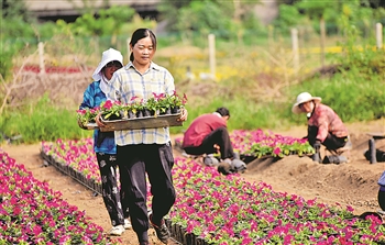 9月22日,王素霞(左二)在花卉基地搬运盆栽花卉。王素霞是河北省邢台市和阳镇南关村花卉种植基地的一名“花匠”,近年来,她通过花卉种植实现增收,并带动同村姐妹加入花卉经济中来,帮她们实现家门口就业。新华社记者 朱旭东 摄