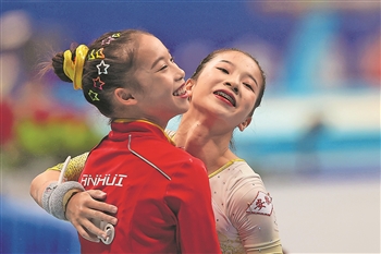 9月22日,安徽队选手何骊澄(右)在高低杠比赛后与队友拥抱。新华社记者 许雅楠 摄