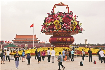 9月23日,北京天安门广场“祝福祖国”巨型花篮主体结构吊装完成,游客在花坛前参观、拍照。花坛是为庆祝中华人民共和国成立72周年布置在天安门广场的。整个大花篮顶高达18米,篮体高16米,篮盘直径12米,自下而上由坡面花坛、玻璃缸篮肚、玻璃缸篮盘和篮信组成。花篮里插有约10朵巨型仿真花,每朵重达上百斤。