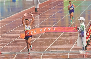 ▶青海选手仁青东知布以2小时14分26秒的成绩率先撞线,夺得男子马拉松冠军。