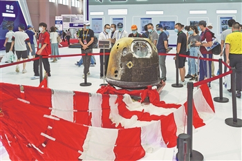 9月29日,观众在航展上观看嫦娥五号返回舱和降落伞。