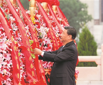9月30日上午,党和国家领导人习近平、李克强、栗战书、汪洋、王沪宁、赵乐际、韩正、王岐山等来到北京天安门广场,出席烈士纪念日向人民英雄敬献花篮仪式。这是习近平整理花篮上的缎带。新华社记者 张领 摄