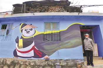 10月7日,山东省烟台市莱山区朱柳村,村民站在功夫熊猫主题的彩绘墙前。今年以来,朱柳村依托本村青年美术人才资源,对全村2万余平方米民房墙体进行整体彩绘,呈现出各式各样的动漫场景和卡通人物,成为游客的热门观光打卡地。唐克 摄/视觉中国
