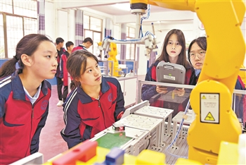 10月9日,湖南省邵阳市洞口县雪峰博雅职业技术学校,学生在练习工业机器人物品搬迁实践操作。近年来,该县采取“校企结合”“工学结合”等方式发展职业教育,通过课程设置与企业需求对接,订单培养职业技术人才,提高学生就业率。本报通讯员 滕治中 黄亦龙 摄