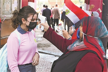 10月10日,在埃及开罗的一所中学,学生入校前接受体温测量。