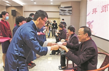 10月11日,国家级名老中医专家、上海中医药大学博士生导师沈舒文等15位国医大师,正在陕西省西咸新区举行的“名中医 师带徒”拜师仪式上接受28名新弟子的拜师礼。为进一步弘扬中医药传统文化,加快人才培养步伐,促进中医药事业快速发展,西咸新区特地举办了此次拜师活动。本报通讯员 吴宽宏 摄